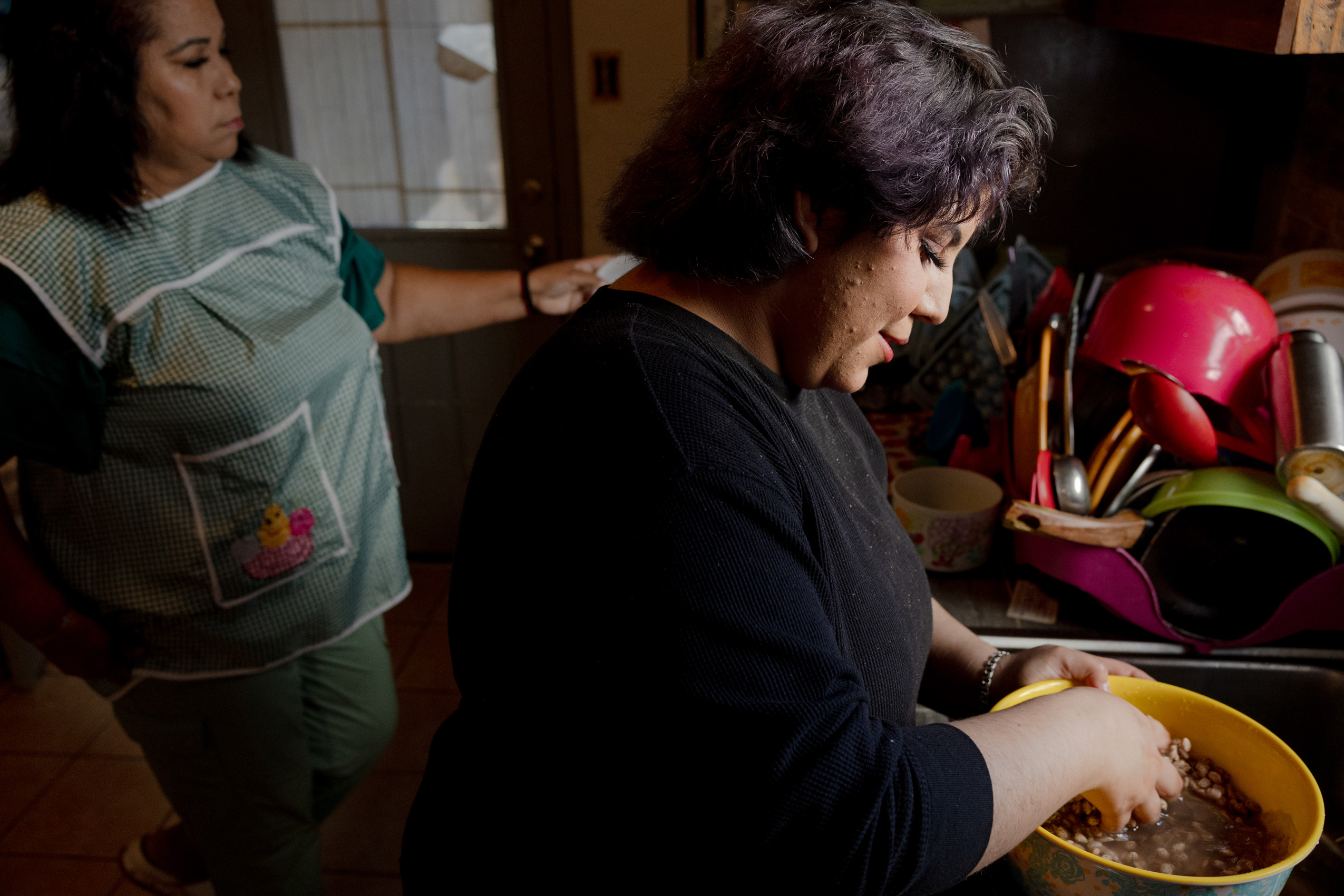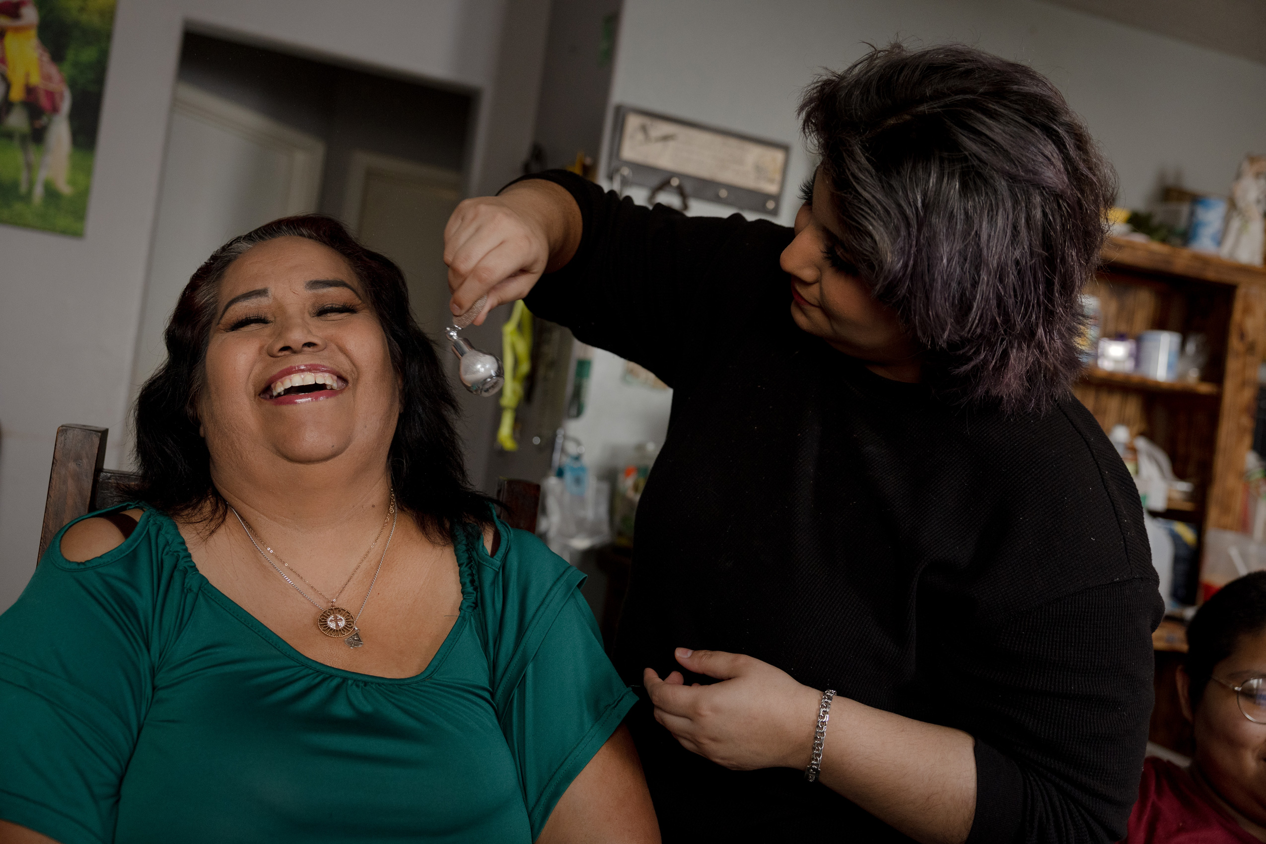 As she stood on the corner of the kitchen table, family members gathered around her, arms touching. Morales passed from child to child, french-braiding one girl’s hair, and brushing and smoothing the ponytail of her granddaughter, Kiomy.