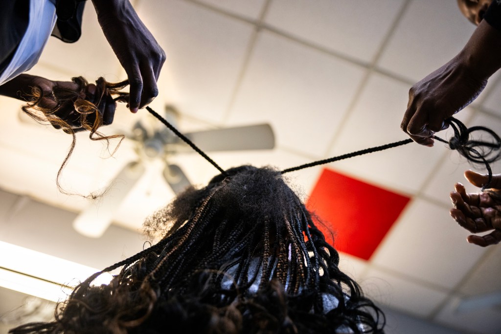 Next to him, Mariola Nchama applied mousse to Onome Arusiuka’s finished braids, while another stylist began to rebraid Nicol Soto’s hair.