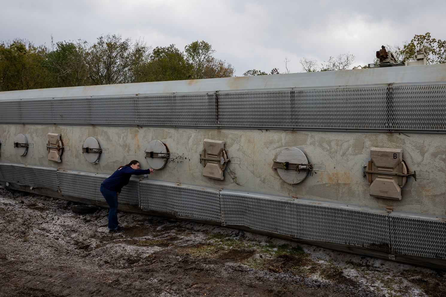 Near one tipped train car, Medcalf gestures to a resident’s chicken coop, looking concerned. The resident had about six train cars in his yard after the incident. It also rained the night of the derailment, meaning water could have moved the plastic around.