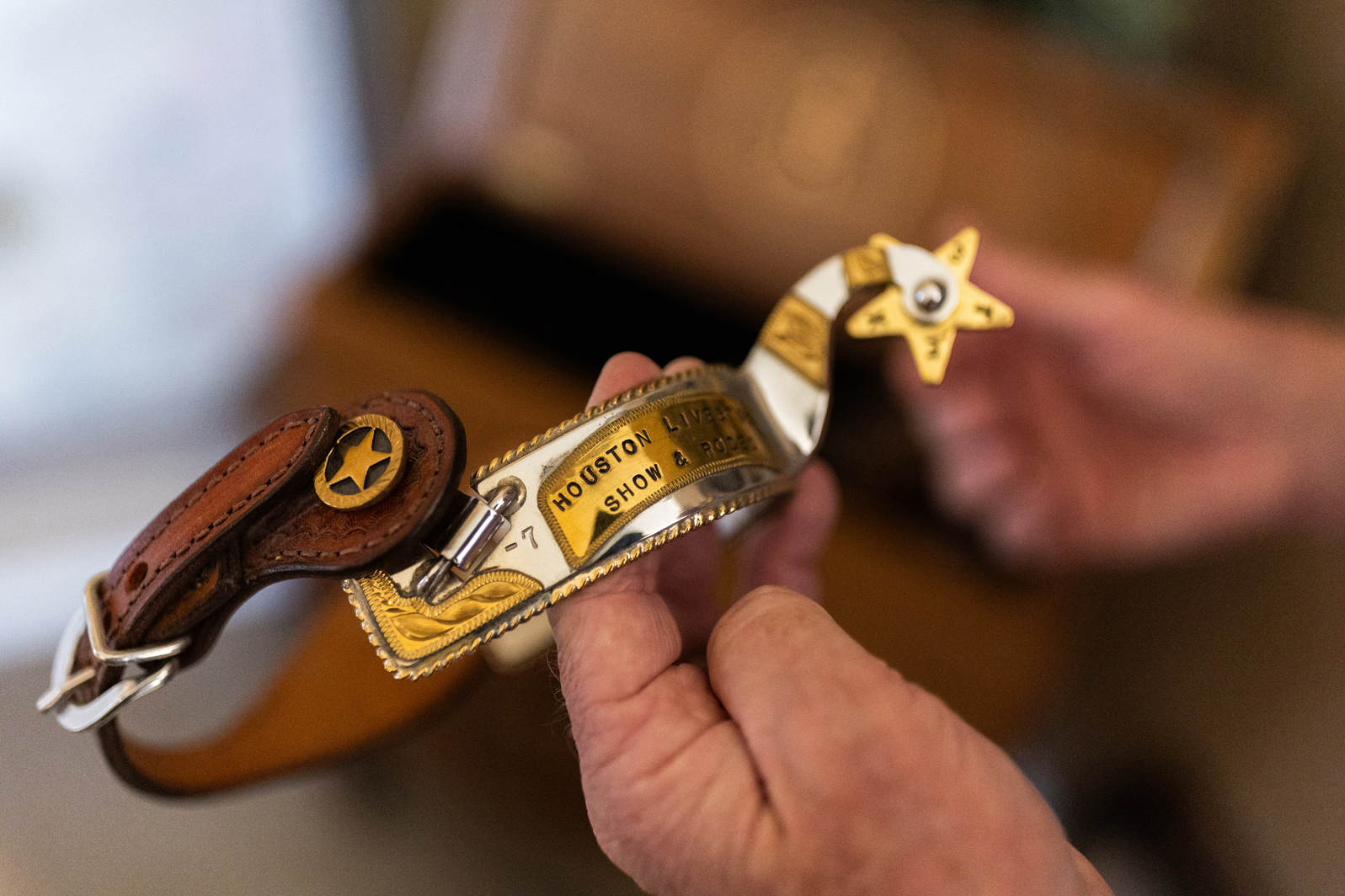 The son of a rancher, Hudgins recalls riding horses as early as 3 years old. He competed in youth rodeos, winning shiny belt buckles that he still has on display in his office.