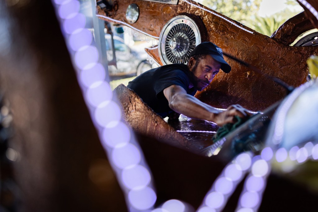 That day, the tasks at hand were checking electrical connections and water levels, along with final touches like wiping down windows. The four days that comprise the art car celebration are a special time for them all. As Joe Haden says, “The parade weekend is like a family reunion. It’s my favorite time of the year.”