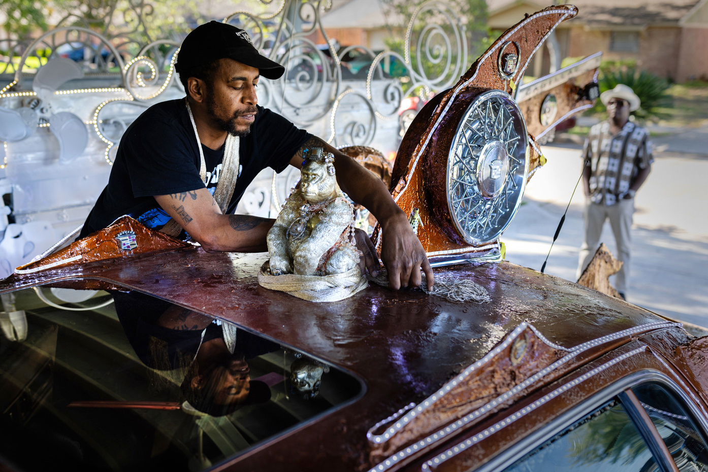 The street where champion art car artist Rickey Polidore lives looks like most other blocks in his Hiram Clarke neighborhood in southwest Houston. That is, until you near his driveway and see the two extravagantly decorated art cars parked under a canopy – and Polidore himself in a zebra-striped buggy, zooming down the block, around the corner and back, then parking on his front lawn.