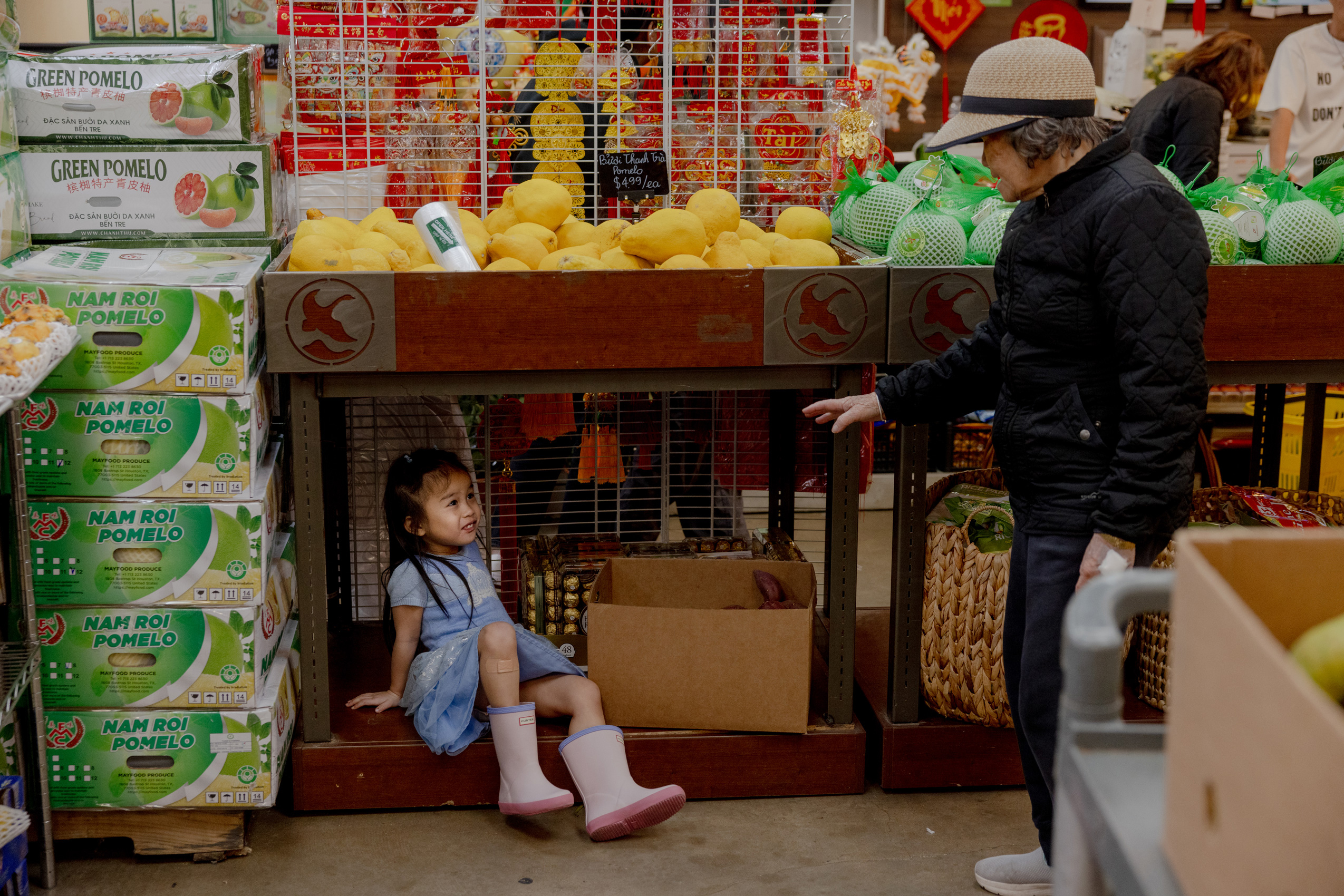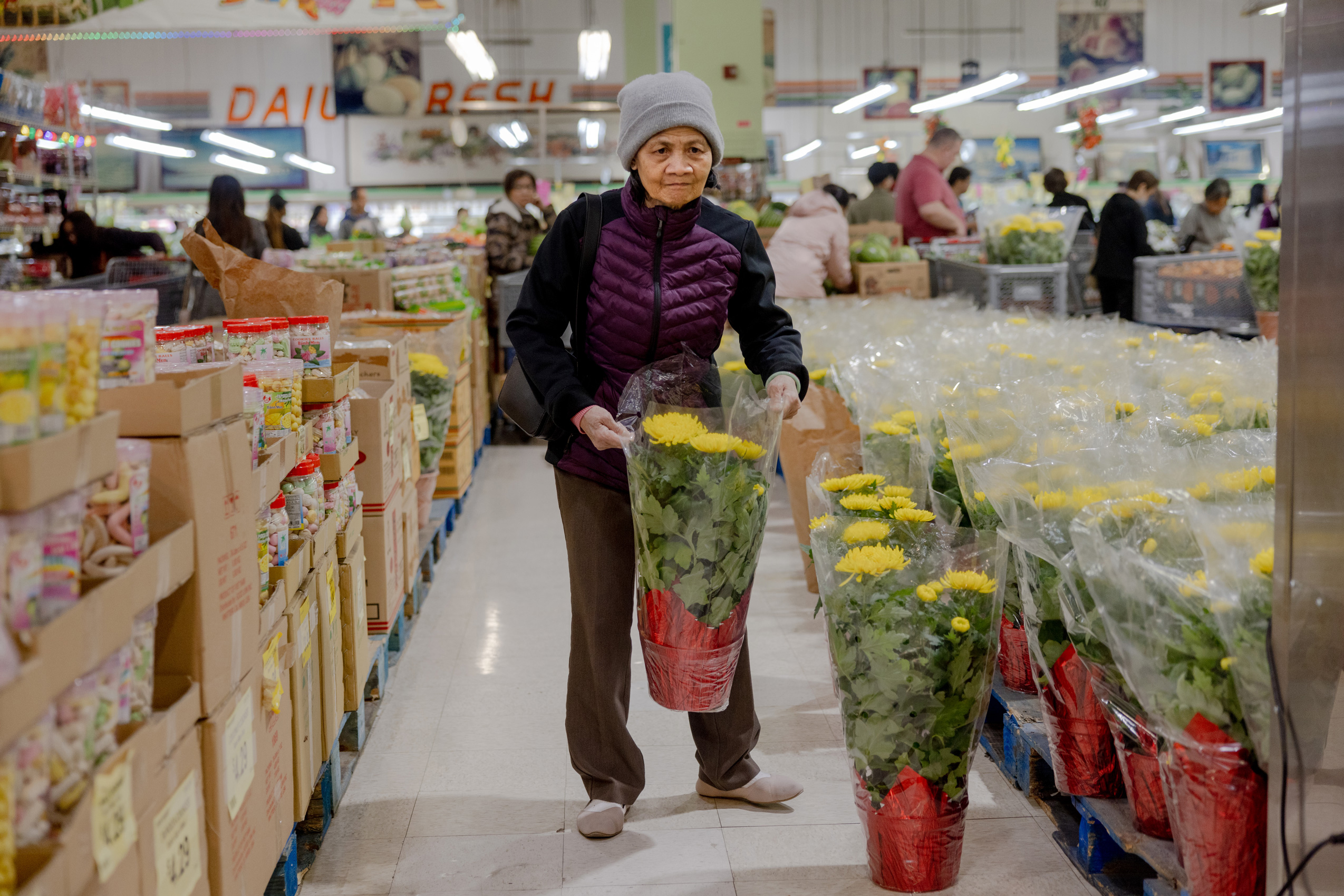 Owner Linda Nguyen weaves through the crowd in a bright pink jacket and a radiant smile, pointing to the rows of fruit she puts together for a traditional Lunar New Years fruit basket — fist-sized oranges, kumquats, dragon fruit, half a dozen types of mangos and more, all wrapped and covered with red and gold stickers wishing the customer a happy new year.