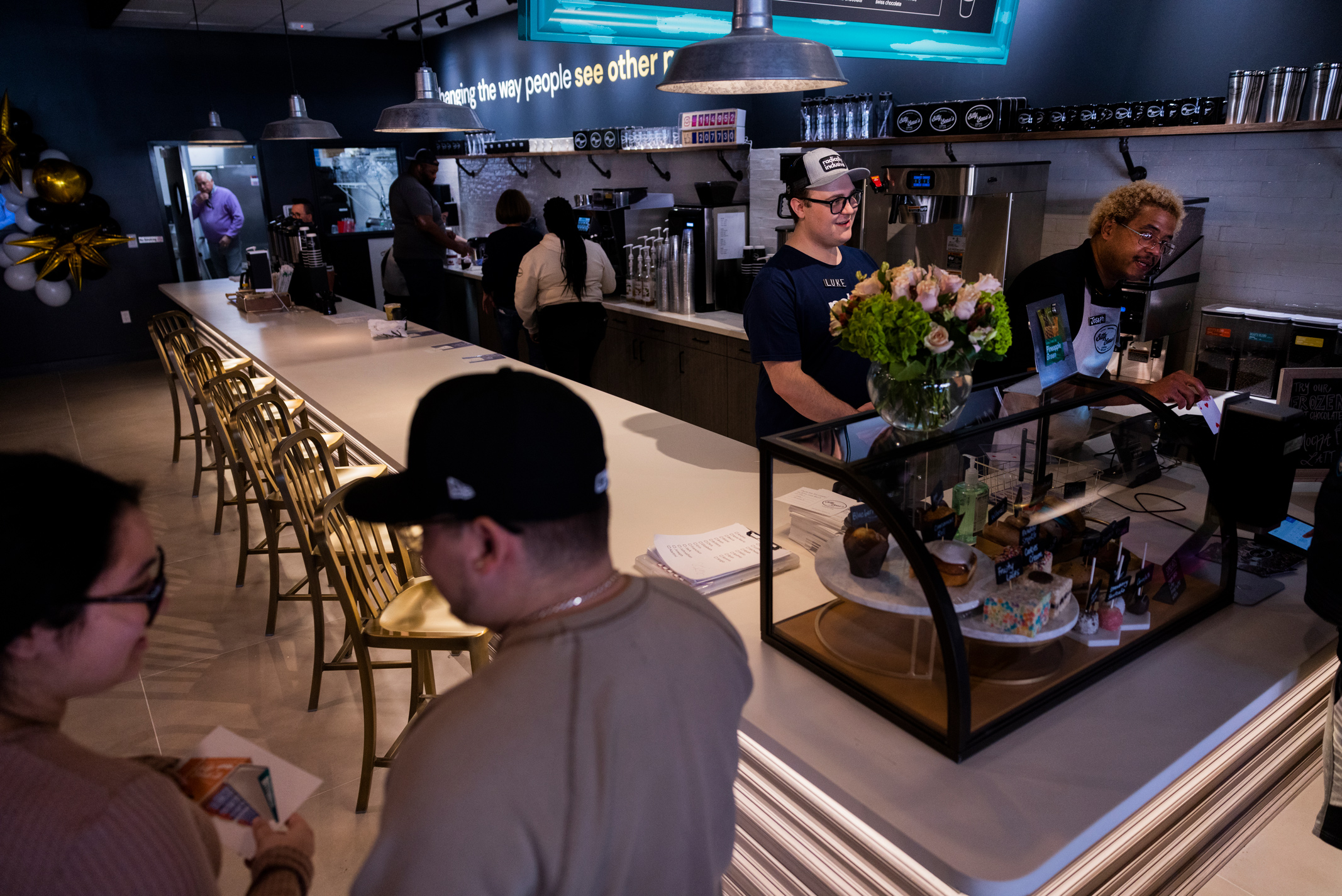 Some shifts are busier than others, but even on slow shifts, Suarez is busy. He’s making conversation with customers, complimenting them on their attire, offering high-fives and recommending some of his favorite drinks (frozen hot chocolate tops the list).