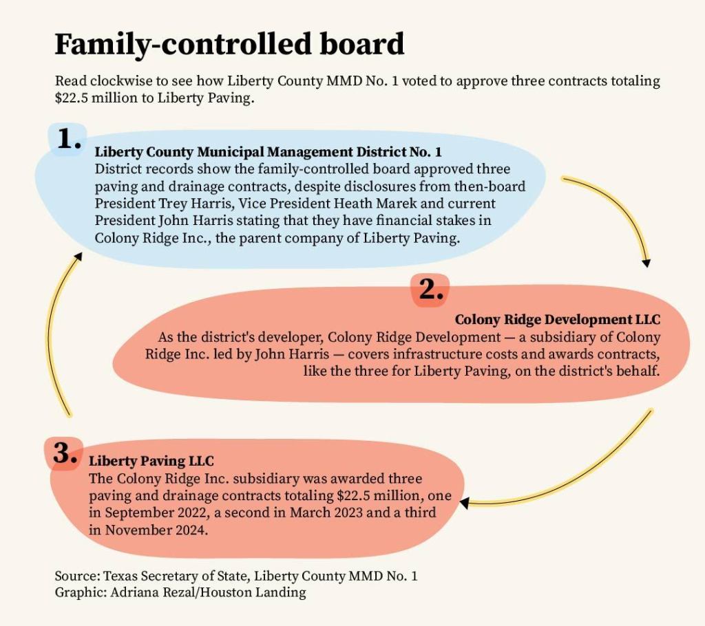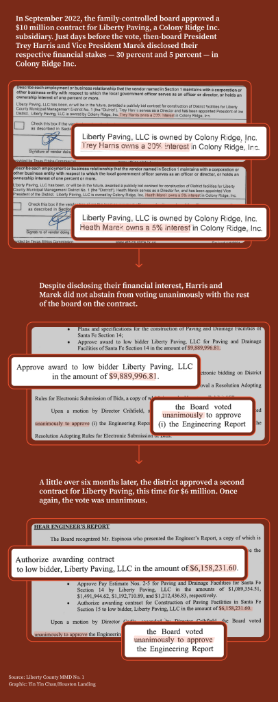 Meeting minutes and district records show that between 2022 and 2023, the family-controlled board unanimously approved two contracts totaling $16 million for the Colony Ridge Inc. subsidiary. According to the minutes, a third contract for Liberty Paving was approved in November 2024 for $6.5 million.