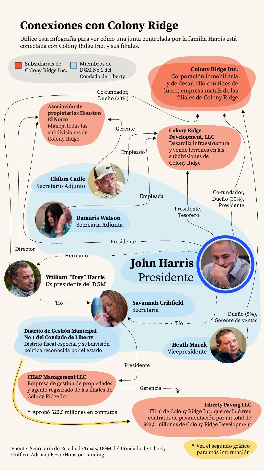 Además de ser presidente de la junta y presidente de Colony Ridge Development, John Harris es presidente de la Asociación de Propietarios de El Norte Houston. La empresa de Crihfield, CH&P Management, actúa como agente registrado de la Asociación de Propietarios, Liberty Paving y varias otras filiales de Colony Ridge, según los documentos presentados por la Secretaría de Estado de Texas.