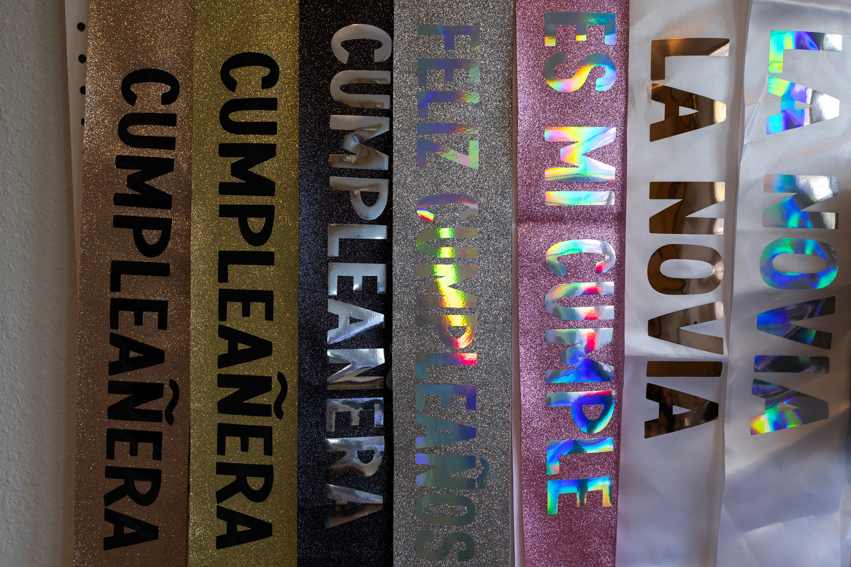 Today, they design and sell sparkly, rhinestone filled, colorful tiaras and sashes for every occasion, from birthday themes such as “Cumpleañera” and “Es Mi Cumpleaños,” to bridal themes with “La Novia,” or holidays like “Feliz Navidad,” “Feliz Año,” and more, all aiming to appeal to the many Houstonians who share similar cultural background and speak Spanglish.