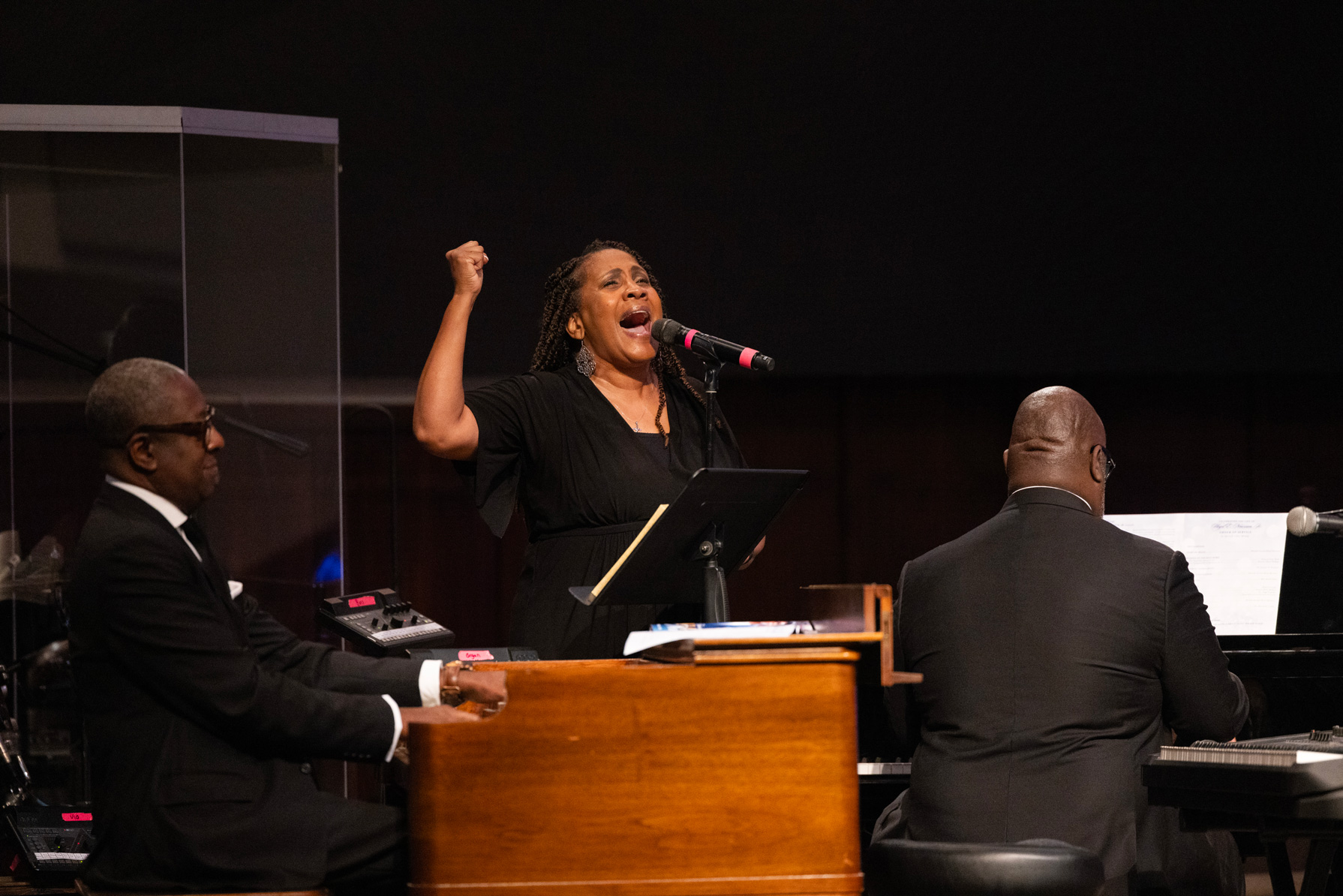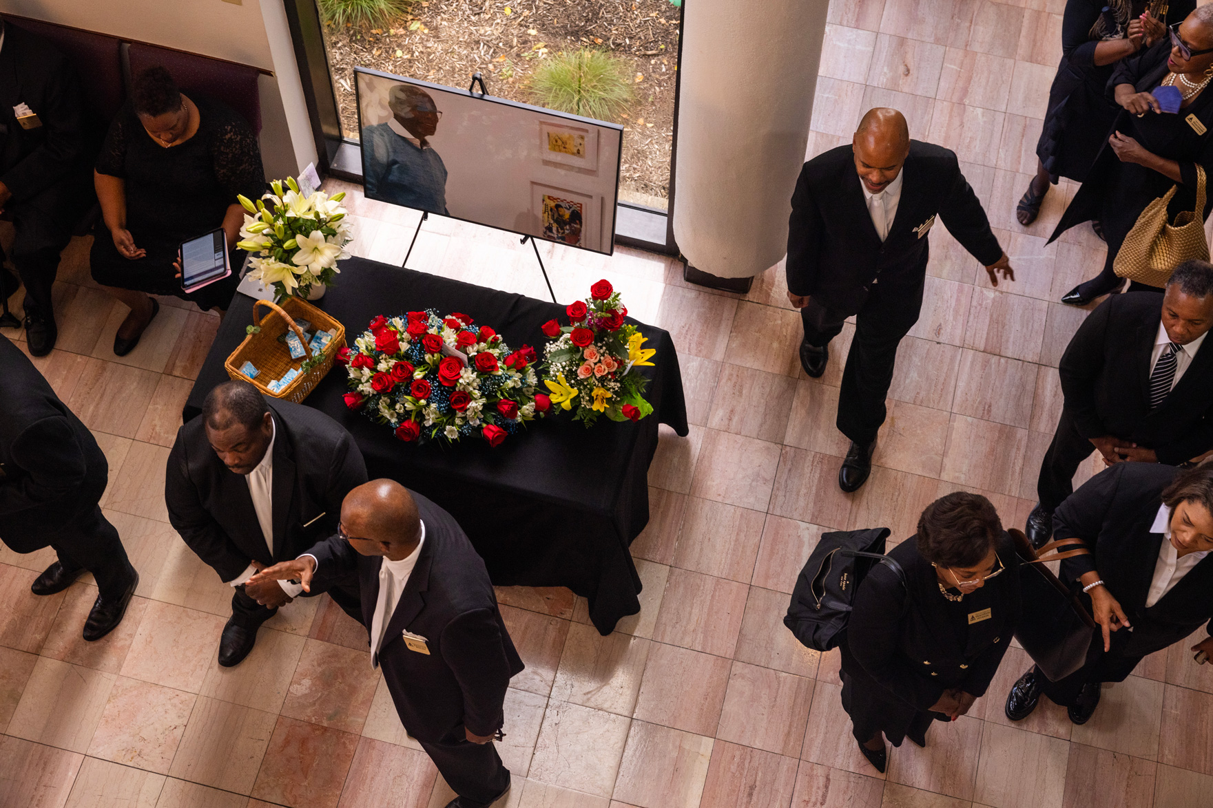 As the nearly two-hour service wrapped, Cosby instructed attendees to comply with Newsum’s one wish at his service: to celebrate and engage with his large 16-by-38 foot “Grace and Mercy” plexiglass piece that adorns the atrium of Wheeler Avenue Baptist Church.