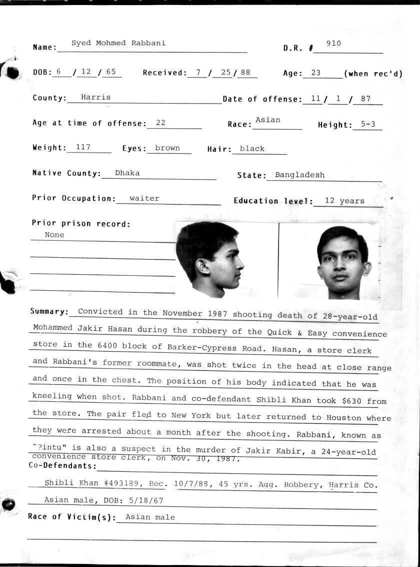 1988 – Rabbani is convicted of the 1987 murder of Mohammed Jakir Hasan and sentenced to death in Harris County’s 262nd District Court.