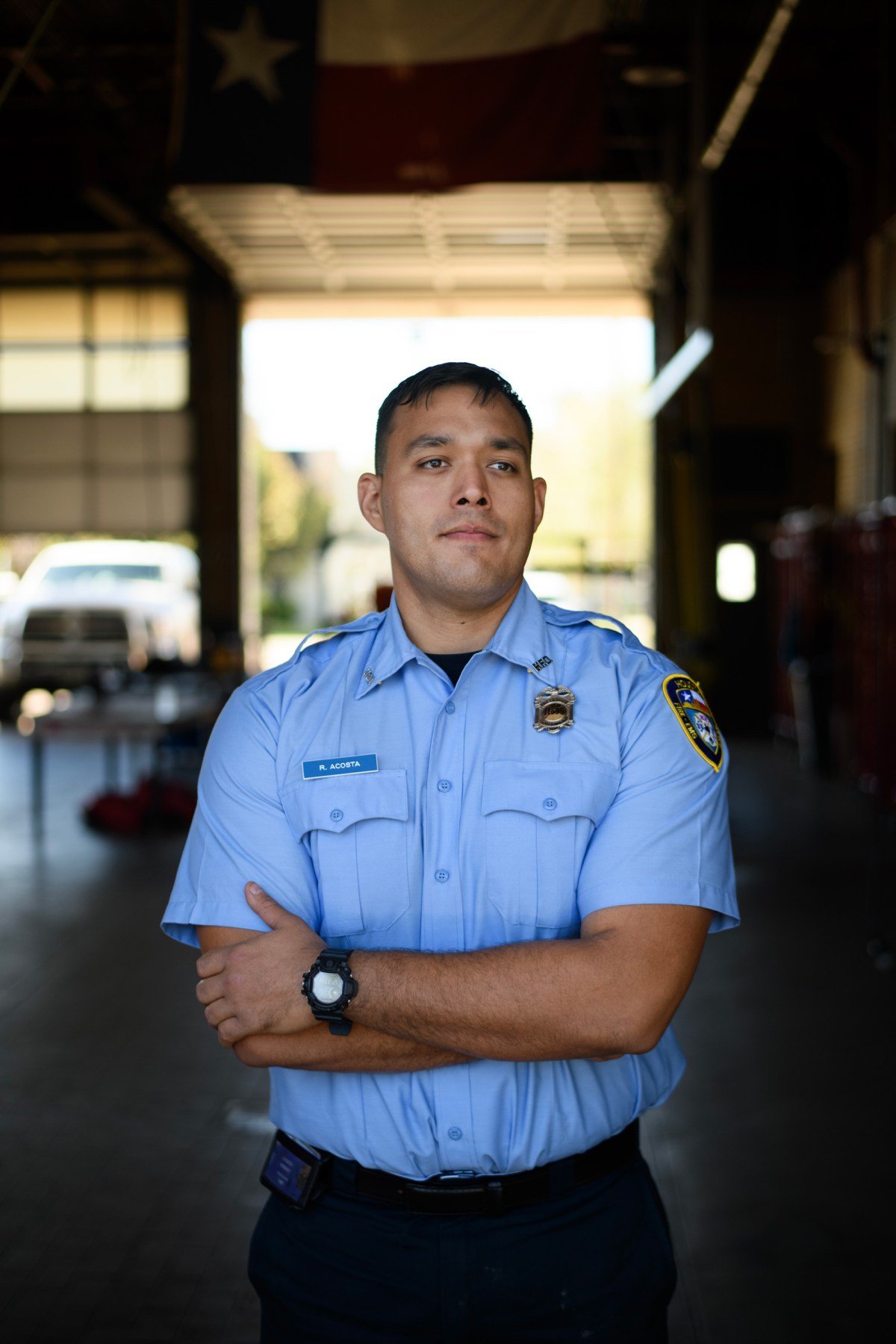 As Robert Acosta posed for pictures, a fellow firefighter slipped in the room and slyly began snapping his own photos.