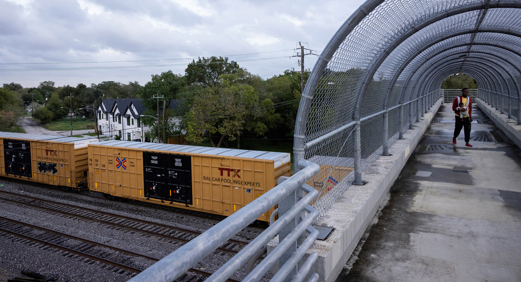 Sandra Auzenne came to Houston’s Greater Fifth Ward after evacuating New Orleans post-Hurricane Katrina. Now, she must deal with life living across from the train tracks. In a typical week, she picks her granddaughter up from school, goes to doctors’ appointments, and also worries about the crack in her home’s foundation. “If I had known about all this before, if someone had told me, I would have never moved in here,” she said. (Antranik Tavitian / Houston Landing)