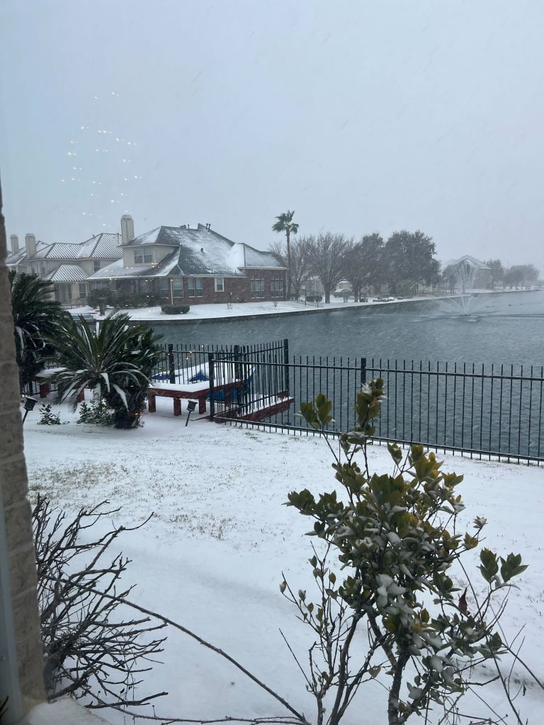 La ciudad y la región están cubiertas de nieve que sigue cayendo. Las cámaras web de la Universidad de Houston muestran nieve en todo el campus.