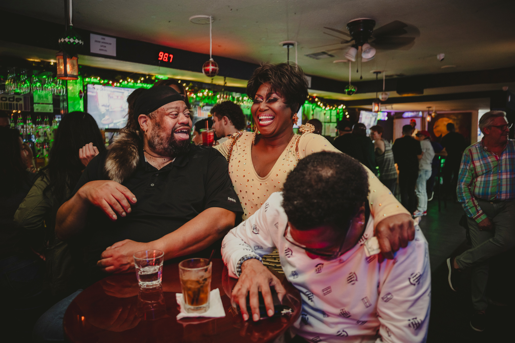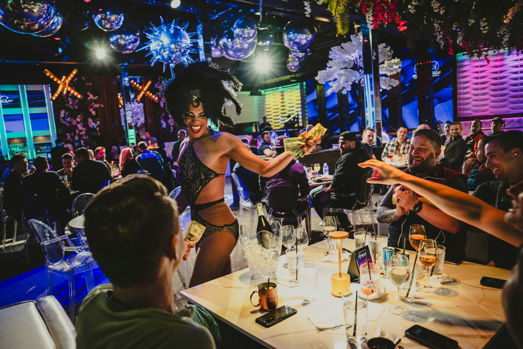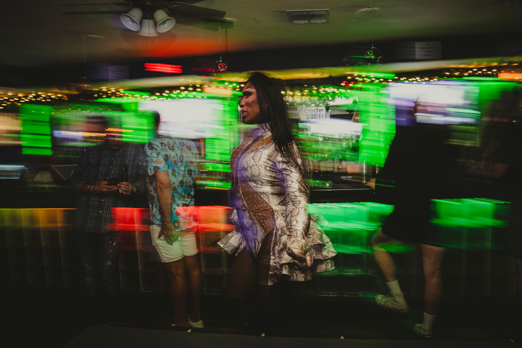 The cozy trailer-like bar was packed by 11 p.m. on a recent Friday night in December, just minutes after Collins took the stage performing “Push the Button” by Jennifer Hudson. With a glass of champagne in her hand, she lip synced to the tune while her gold thigh-high dress and foxtails beamed in the spotlight, and as an audience member stuffed $1 bills in her bosom.