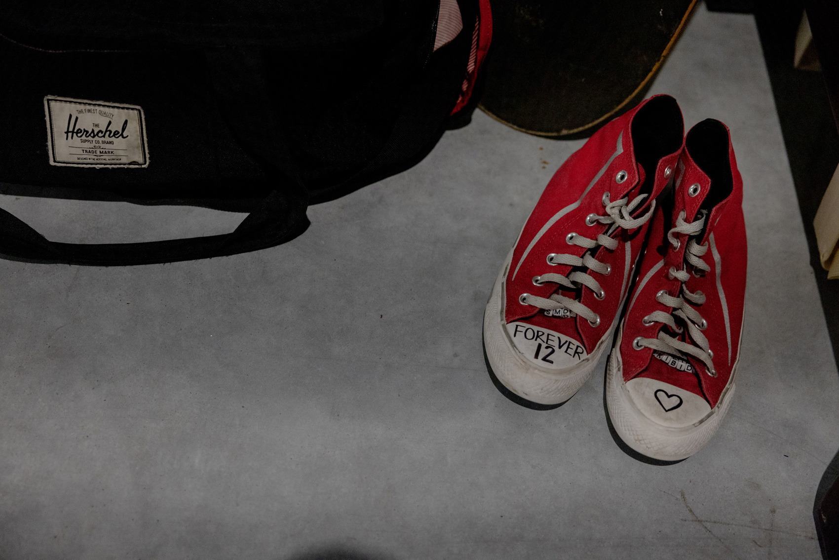 There are no signs of the girly dress-up outfits from Jocelyn’s youth. Red, high-top Converse sneakers sit together on the concrete floor by Jocelyn’s cluttered desk, and baggy, grunge clothing is stored in boxes and a dresser in the corner. Posters for Arctic Monkeys and Lana Del Rey hang on the metal walls above Jocelyn’s bed. The electric guitar Jocelyn had begged her mom to buy, yet never learned to play, is a reminder to Alexis of her daughter’s unfulfilled potential.