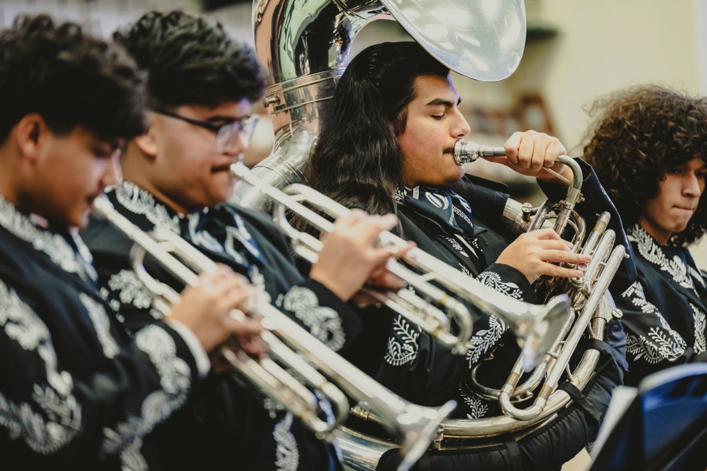 “That’s the fun part about teaching these kids,” said Guzman, who picked up jazz and mariachi music as a middle schooler. “Everything that they’ve learned from when they started in sixth grade is based on notes on a page, and folk music is not about that. It’s more about training your ears. …There’s two kids in there that can’t read music, but they’re picking everything up by ear.”