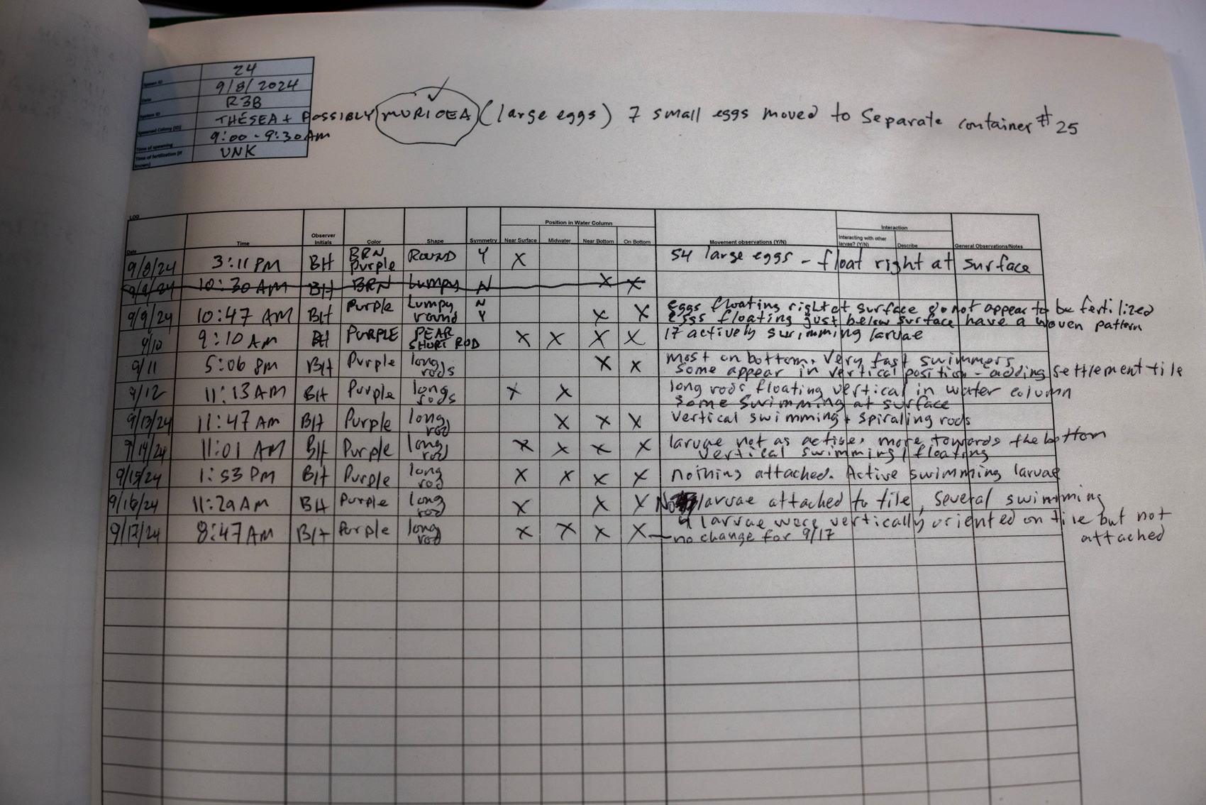 “I have to go through these containers every two days, I do water changes, I count larvae, I count eggs, I do a little prayer,” Higgins said. “You got to get that little (settling) tile in there and just the right way so they don’t just stick the plastic container instead. If you wait too long to put in the tile, the coral dies. If you put the tile in too soon, that could be a problem.”