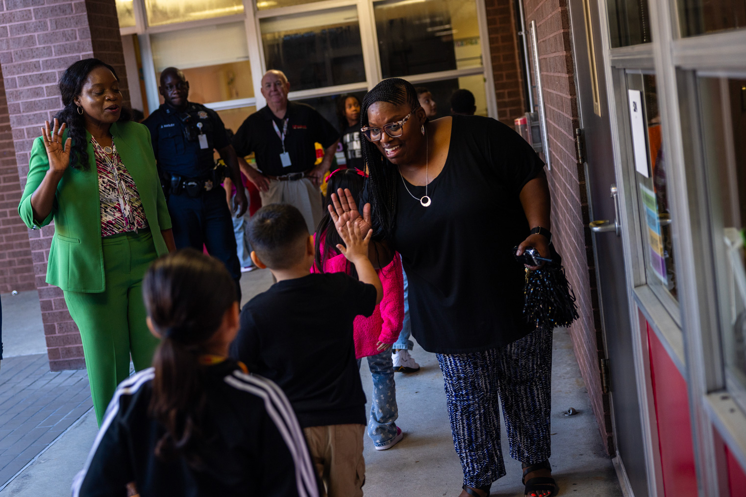 She commands every space she enters, and not just because her outfit for the occasion is a striking jade green pantsuit. Children gleefully high-five the seventh-year superintendent as she strides through the halls. Teachers stop in their tracks to greet her, bouncing in excitement as they embrace. Her jokes, told through a beaming smile, send ripples of laughter through classrooms.