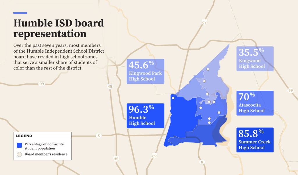 Currently, three of Humble’s seven board members reside in the boundaries of Kingwood High School, where about two-thirds of students are white. The other four live in areas serving Atascocita High School, where about one-third of students are white.