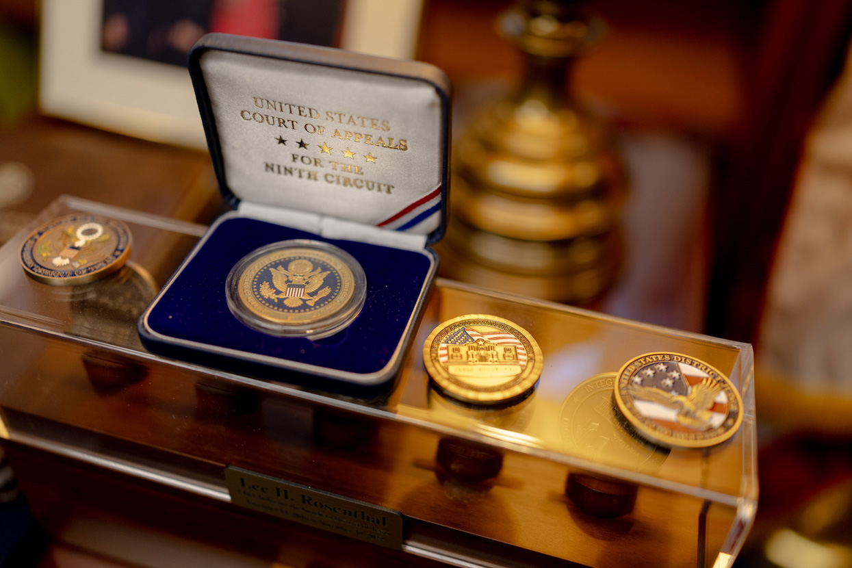 Rosenthal’s office is located in the Bob Casey Federal Courthouse on Rusk Avenue in downtown Houston. The walls are lined with bookshelves filled with innumerable photographs of colleagues, family and friends, tokens of gratitude like T-shirts and coffee mugs from colleagues and former clerks, and binders containing files from old cases.