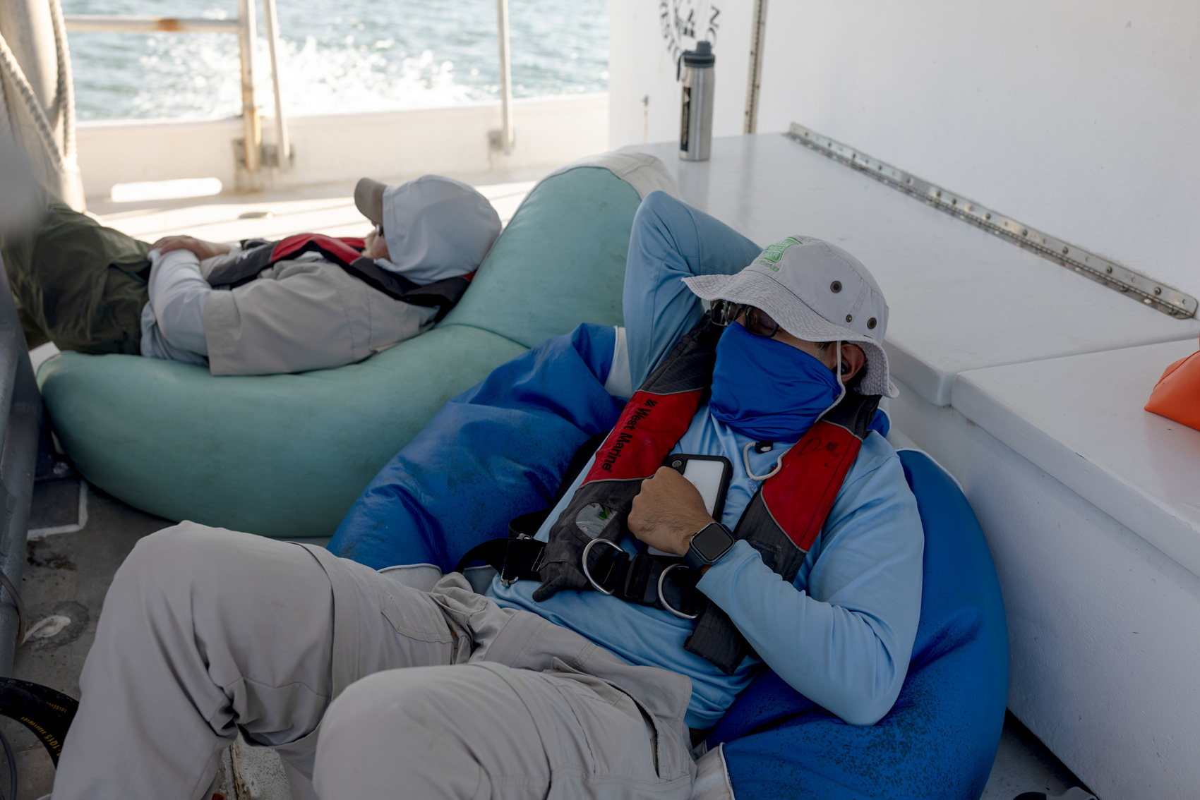 The RV Jacinto has several large bean bags onboard so crewmembers can take it easy on the way out and back. Some take naps, others listen to music. And they trade jokes, having gone out to dinner the night before to celebrate the summer intern’s last days with the team.