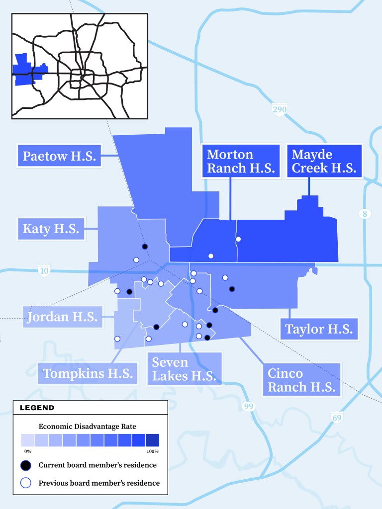 In Katy and several Houston-area districts, school boards have employed an election system — known as “at-large districts” — that has contributed to most trustees living in wealthier neighborhoods, a Houston Landing review of election records shows. As a result, many families and students in lower-income areas have had no nearby board members representing their interests.