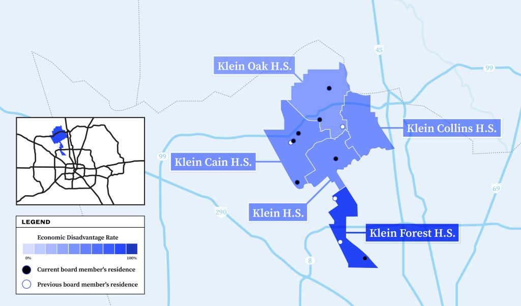 In Klein, most high schools serve similar student demographics, with one exception. About 90 percent of Klein Forest High School students are Black or Hispanic, and 80 percent of students are considered economically disadvantaged by the state. Even still, three of the district’s last 11 trustees lived in the Klein Forest area.