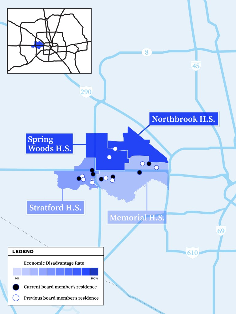 In Pasadena, four of the district’s seven trustees live within 1 ½ miles of each other. In Spring Branch, an overwhelming majority of trustees have lived in wealthier neighborhoods south of Interstate 10 over the past decade. And trustees in Humble have typically lived anywhere but their district’s less-affluent areas.