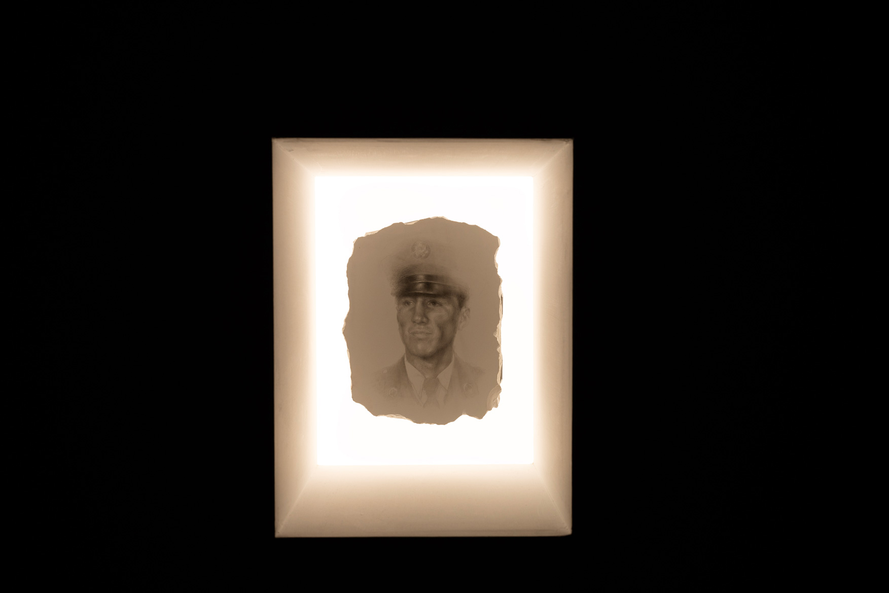 The couple infused the bayou detritus into a white gypsum statue of a Madonna, one hand slightly deformed in the casting. The bits of the bayou fracture the Madonna. An almost cherubic sketch of Campos Torres, in his Army dress uniform, is illuminated on the opposite side of the museum wall.