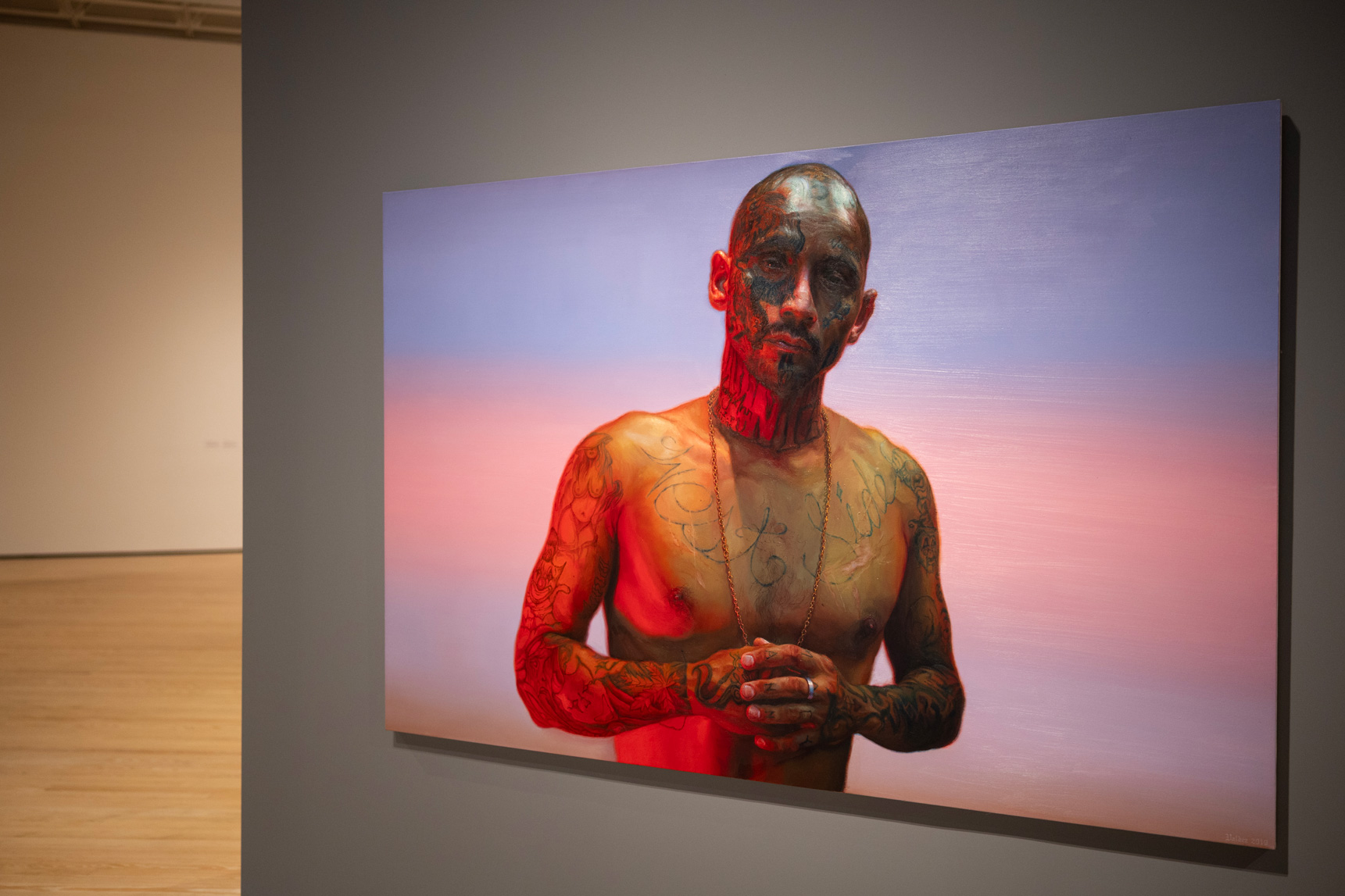 Valdez is best known for his arresting, 30-foot-long 2016 painting of 14 modern day Ku Klux Klan members looking out of the canvas, caught in a staredown with the viewer. There are several women among the hooded figures. One hooded man holds a startled hooded infant playing with a Pikachu toy and pointing out accusingly at the watcher. Another holds an illuminated cell phone in his hand, the clearest indication the image is set in the present, not the past.