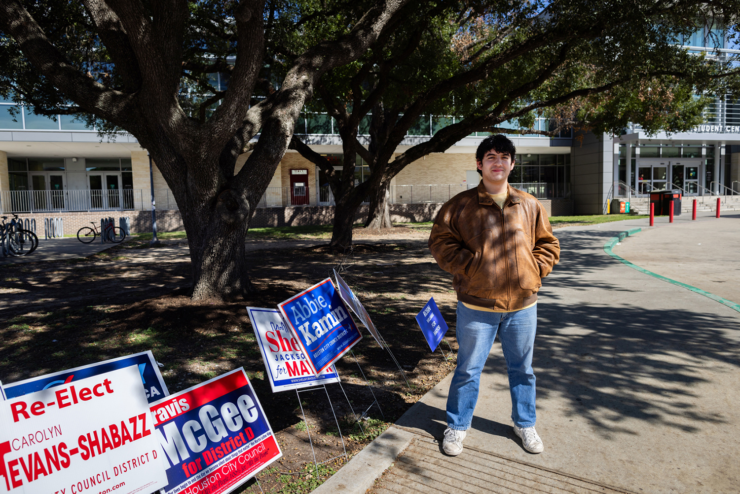 Dozens of campaign signs line the sidewalks at the University of Houston’s student center, signaling one last attempt to capture the vote of the students heading inside to cast their ballots.