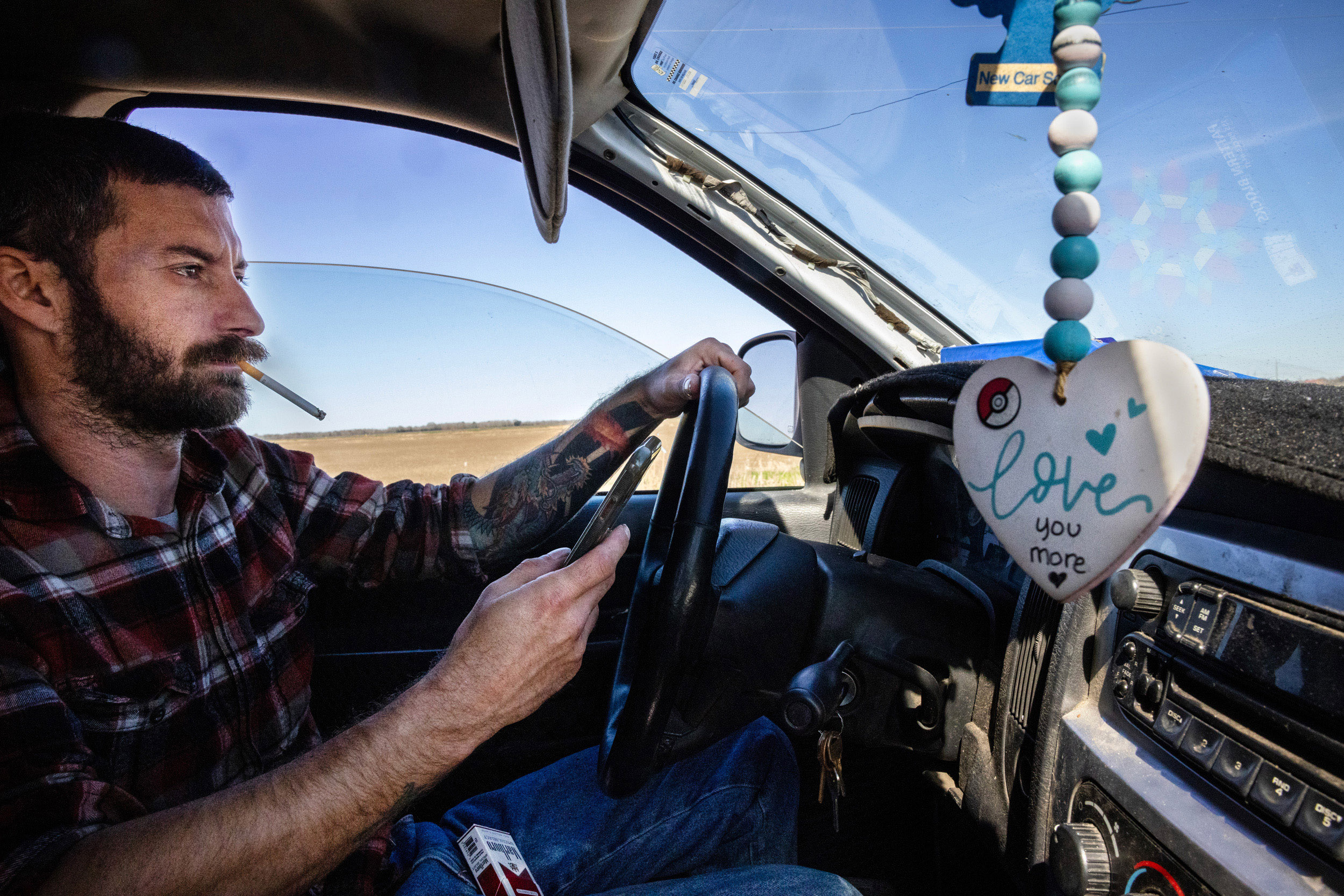 Rozelle is dragging a big white trailer behind his truck, so he’s only going about 55 mph. He cracks open an energy drink from the front seat.