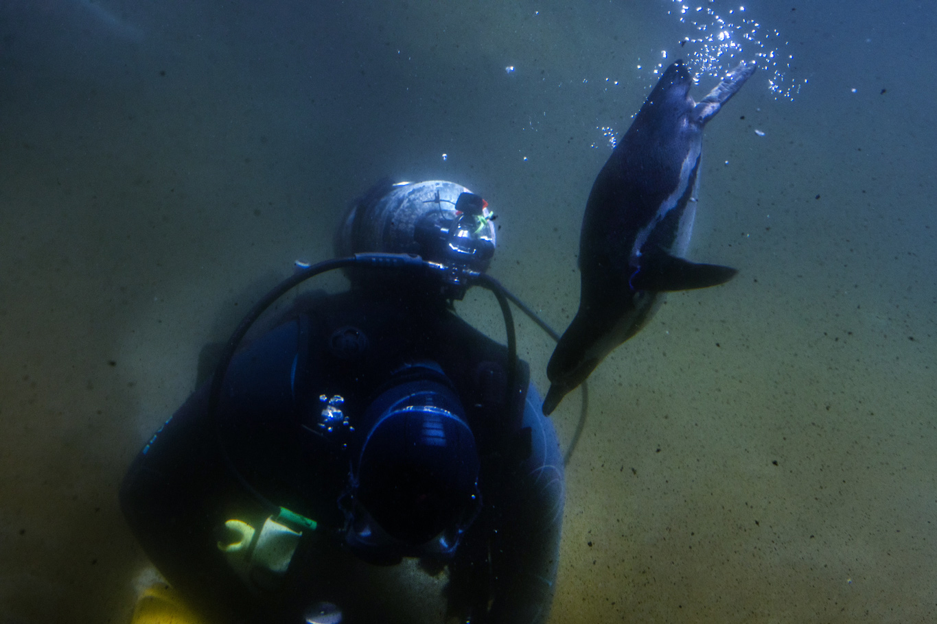 Inside the new Galapagos Island exhibit, penguins spent much of Thursday morning diving through the water as their keepers underwent their weekly cleaning of the enclosure, buffing algae off rocks. The penguins love the feel of the air bubbles being emitted from the keepers’ dive equipment and they zip and flit through that bubble stream over and over again in a high-speed bubble-bursting ballet.